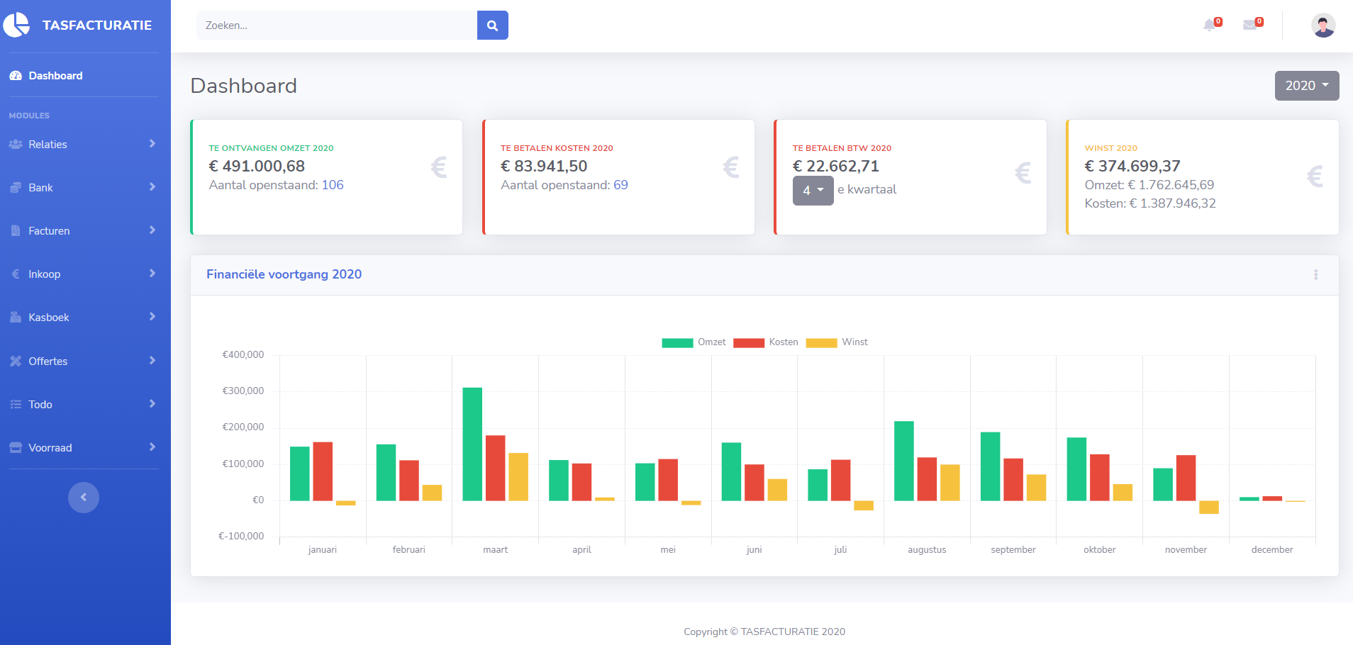 Wil jij ook gemakkelijk en snel een factuur maken en versturen aan je klant? Met het factuur- en boekhoudprogramma TASFACTURATIE maak je heel eenvoudig facturen, uiteraard in je eigen huisstijl.